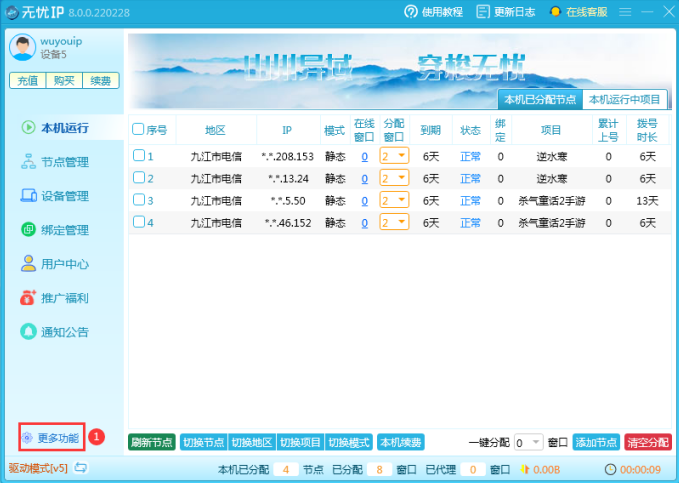 9. 已分窗口:可以查看到节点分配窗口情况,点击后可释放此节点,在本机或其他电脑上分配的窗口。